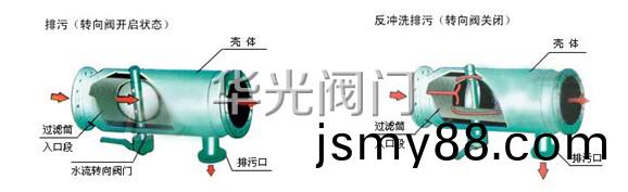 正(zheng)常(chang)沖洗(xi)時(shí),水(shui)流(liu)轉(zhuǎn)向(xiang)閥為開(kai)啟狀(zhuang)態(tài)(tai)。當(dāng)(dang)濾網(wǎng)(wang)截留(liu)水(shui)中的細(xì)(xi)小顆粒(li)雜質(zhì)及(ji)懸浮物(wu)達(dá)(da)到一定(ding)數(shù)量時(shí)(shi),將排(pai)污口上的(de)閥門(men)打開(kai),即(ji)由于(yu)水(shui)流的作(zuo)用將(jiang)粘在過(guo)濾器收(shou)集段(duan)部分的(de)雜質(zhì)(zhi)沖(chong)質(zhì)(zhi)沖(chong)洗直到排(pai)出水(shui)清澈為(wei)止。再(zai)關(guān)(guan)閉排污(wu)口(kou)上的(de)閥門進(jìn)(jin)入(ru)正(zheng)常(chang)工(gong)作狀態(tài)(tai)。